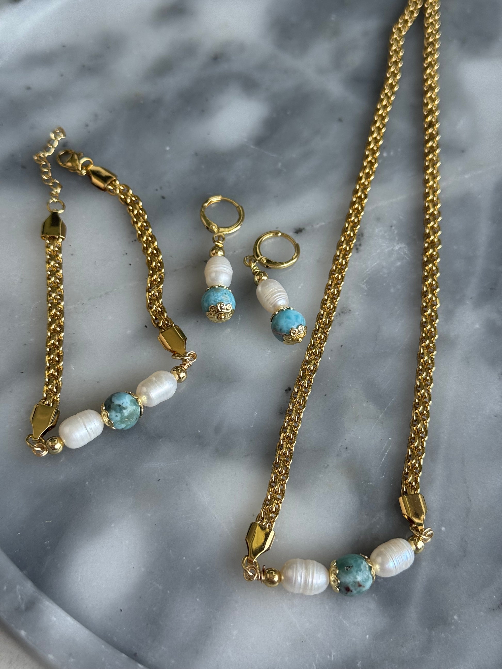 Descubre la armonía y el estilo en nuestra exclusiva colección de joyas, donde la naturaleza se encuentra con la elegancia artesanal. Cada set, compuesto por un collar, una pulsera y unos aretes, ha sido meticulosamente creado para resaltar la belleza única de piedras naturales y perlas genuinas.