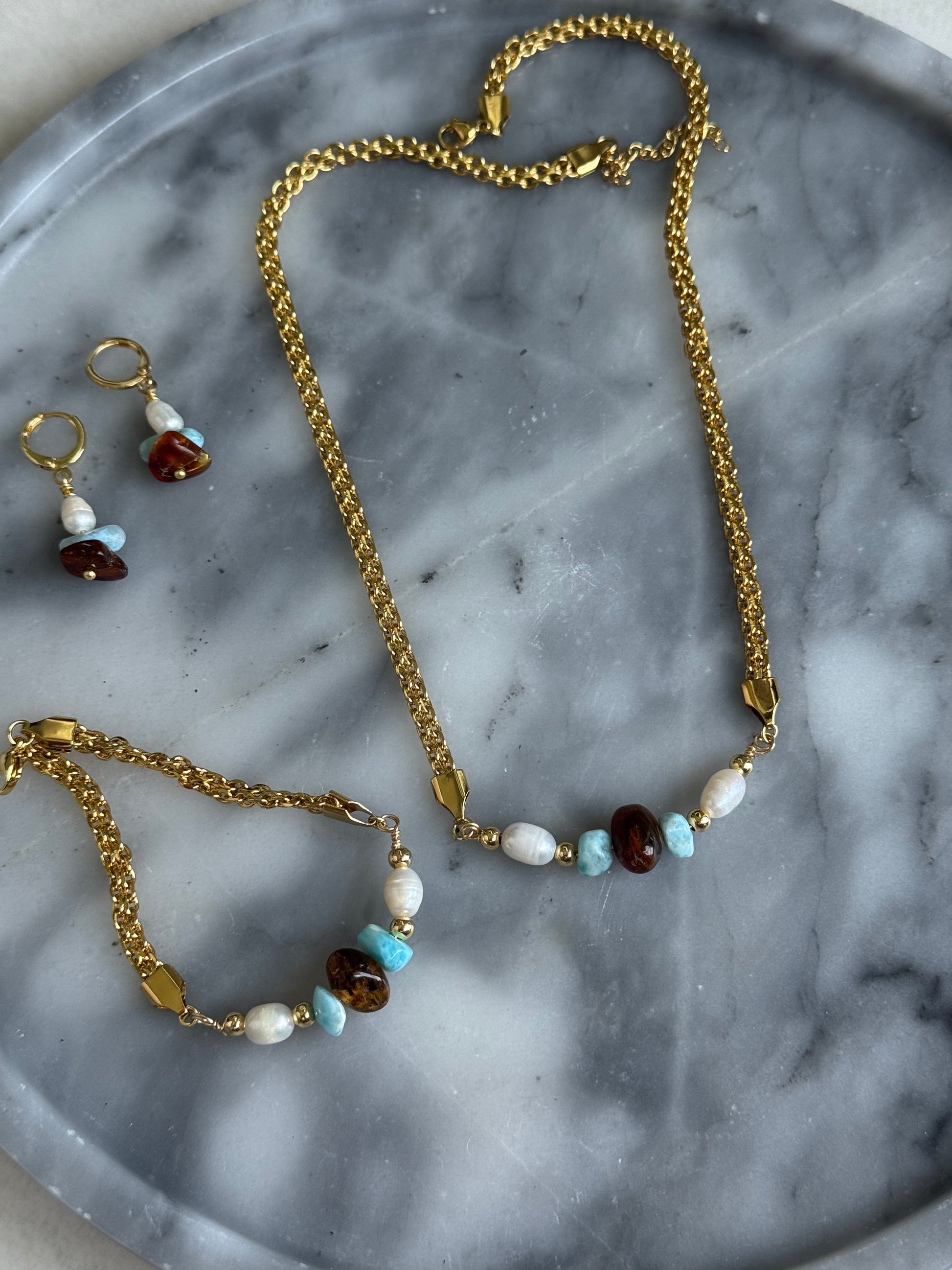 Descubre la armonía y el estilo en nuestra exclusiva colección de joyas, donde la naturaleza se encuentra con la elegancia artesanal. Cada set, compuesto por un collar, una pulsera y unos aretes, ha sido meticulosamente creado para resaltar la belleza única de piedras naturales y perlas genuinas.